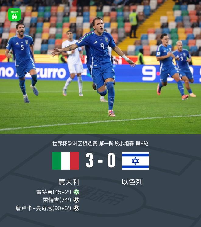 在欧洲世界杯预选赛第一阶段小组第8名的一场比赛中,意大利对阵以色列。上半场停摆时,雷特吉主罚点球为球队首开纪录。下半场,球队易边再战。雷特吉前场断球射门门将扩大领先优势。比赛进入暂停之际,迪马尔科送出助攻,曼奇尼点球点头球破门追回比分。最终,意大利3-0击败对手。重头戏:-45+2分钟,雷特吉补射破门,随后补射破门。意大利1-0以色列。第73分钟,雷特吉前场断球,身后射门扩大比分。意大利2-0以色列。第-90+3分钟,吉安卢卡·曼奇尼头球破门。意大利3-0以色列。亮点:双方球员入场。第6分钟,雷特吉点球低射破门y区,球没能进球。第11分钟,安德里亚·坎比亚森断球打门,皮球稍稍偏出球门。第19分钟,哈利利右路传中,格罗赫头球破门。第28分钟,所罗门布置抽射到禁区,多纳鲁马将球扑出。第45分钟2分钟,雷特吉进球。点,然后按点射门,意大利1-0以色列。 -46分钟,意大利队半场换人。皮奥·埃斯波西托接替拉斯帕多里。 -54分钟,巴雷拉禁区外起跳,皮球高出球门。第61分钟,格洛赫禁区内低射,皮球被多纳鲁马扑出。第66分钟,安德里亚·坎·比亚索出局,随后进球被判无效。第73分钟,雷特吉前场断球后射门扩大比分。意大利2-0以色列。第84分钟,皮奥·埃斯波西托射门进攻区域,球被守门员扑出。第90分钟3分钟,曼奇尼头球破门。意大利3-0以色列 球队阵容技术统计