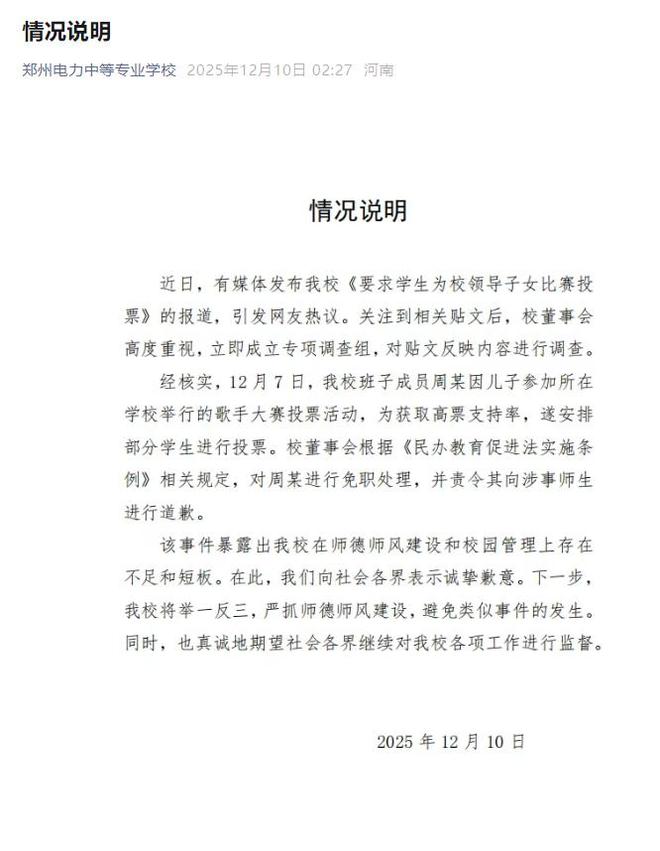 新京报12月10日,郑州电力中等职业学校微信公众号发布了有关情况的声明。图为学校发布的情况声明。以前有报道说“周日一见到XX就投票”。学生们表示,班集体为校领导的子女组织了一次投票。本地响应。近日,河南有学生反映,他们班级群里有人发出通知,号召一名在浙江某大学就读的学生投票评选“校园十佳歌手”。视频中,该学生分享了聊天截图,并在群里晒出了某学校十大歌手之一的舞台照。他还发文称,“这是领导交办的重要任务,组织本班同学给他周某投票,谁有平台就发帖。”海报还告诉大家,“只要看到周某三个字,随后,该博主又发布内容要求班主任删除该视频,并附文“学校领导强行删除该视频”。图为学生分享的聊天截图。网友获悉,该周姓学生就读于浙江一所大学。记者注意到,近日,该校将举行2025年十佳歌手颁奖典礼,网络投票页面显示,周某某确实是在参赛。 12月9日,某学院NG大学官方微博发布推文称,周某某获得第三名。9日下午,记者致电郑州电力职业技术学院工作人员回应称,已通知学校领导调查核实。记者了解到,网上提到的投票事件发生在该校所属郑州电力中等职业学校。具体信息请咨询学校。记者尝试联系郑州电力中等职业学校,但无人接听。记者致电河南省教育厅了解情况。该工作人员还表示,“此事已经有人举报,目前已经证实。”学校公开资料显示,郑州电力中等职业学校成立于1996年,依托郑州电力职业技术学院的教育资源,已成为河南省高等职业学校之一。