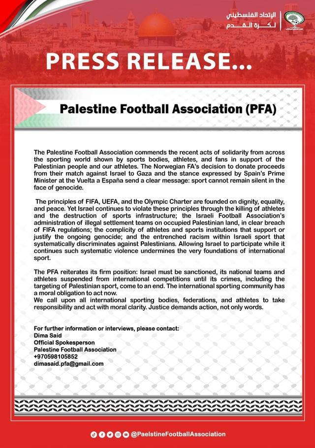 9月的现场直播,巴勒斯坦足球协会的第19-19声明发表了一份官方声明,以表示尊重最近巴勒斯坦的体育人物的统一行动,并进一步呼吁理事机构对以色列足球施加禁令。巴勒斯坦足球协会宣布了以下内容:巴勒斯坦足球协会希望向体育机构,运动员和球迷表现出的最近的团结行动致敬,并感谢他们对巴勒斯坦公民和运动员的支持。挪威足球协会已决定在加沙地区对以色列的收益。西班牙总理在西班牙自行车之旅期间宣布的立场都发出了明显的信号:运动界面不应在种族灭绝前保持安静。 FIFA,UEFA和《奥林匹克宪章》的目的是基于尊严,平等与和平。但是以色列继续遵守这些原则:杀死运动员并摧毁体育基础设施;管理非法惩罚规范所覆盖的巴勒斯坦土地,这显然违反了FIFA法规;宽容运动员和体育机构,以支持或证明正在进行的种族谋杀案;并在以色列体育社区中对巴勒斯坦人的深层系统歧视。在进行这样的系统性暴力时,允许以色列继续参加,这是国际体育基础的主要反映。巴勒斯坦足球协会重申了其稳定的立场:必须对以色列施加惩罚,并暂停国家队和运动员的资格,以参加访谈,直至所有犯罪,包括所有犯罪,包括针对巴勒斯坦体育社区的Ferocrs。国际体育社区有道德责任立即采取行动。我们呼吁所有国际体育组织,协会和运动员承担责任,并以明确的道德立场行事。只是ICE要求采取行动,而不是进行空洞的对话。英超联赛的独家景观是在米瓜